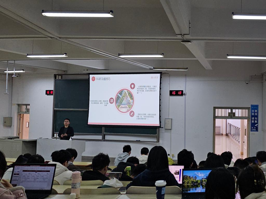 在科研工作方面,王老师强调与导师科研沟通应遵循“准备充分、执行到位、跟进及时”的高效闭环原则。沟通前要梳理问题、准备材料;沟通中要认真记录、如实汇报;沟通后要及时行动并主动反馈进度,以确保科研任务推进有序、高效落地。在面对科研分歧时,他建议同学们保持理性与尊重,主动交流、换位思考,避免消极情绪对师生协作造成不利影响。