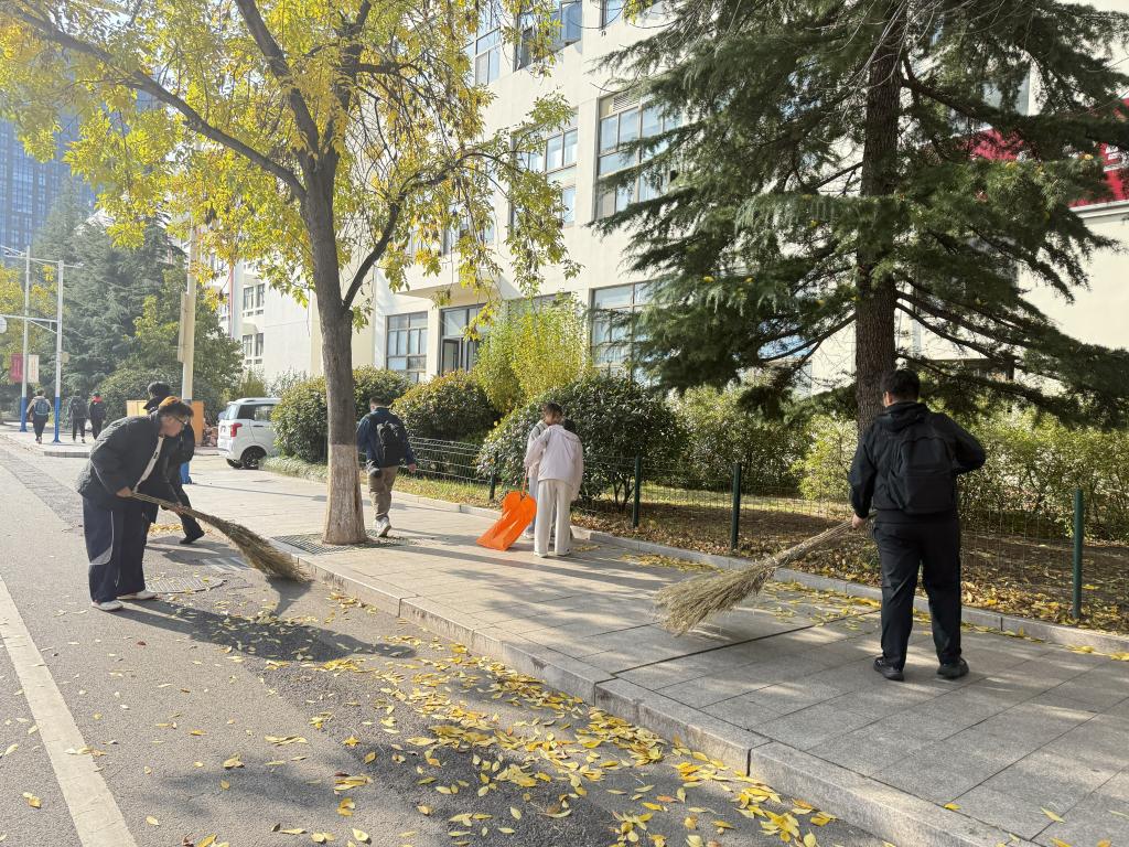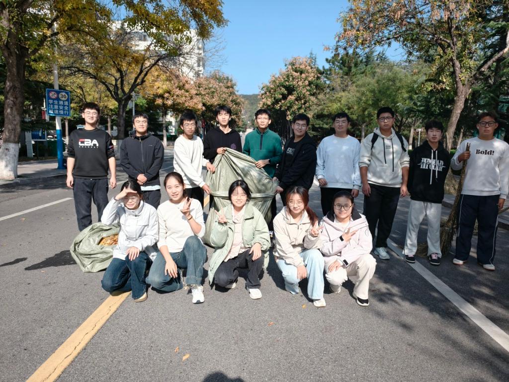 活动前期,团支书刘欣媛提前规划清扫区域,协调筹备清扫工具结合志愿者性别优势与任务需求,将志愿者划分为两个小组,确保活动分工清晰、责任到人。活动中,落叶清扫组的同学按预设区域分段作业,手持扫帚快速将路面堆积的落叶归拢至指定点位,动作高效有序;落叶收集组的同学同步跟进各清扫区域,及时用簸箕将归拢的落叶装入垃圾袋,避免落叶二次飘散。两个小组配合默契、互帮互助,有条不紊推进,确保无清扫死角、无落叶遗漏。经过努力,原本铺满落叶的马路焕然一新,环境变得整洁起来。