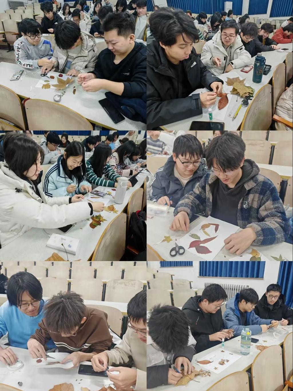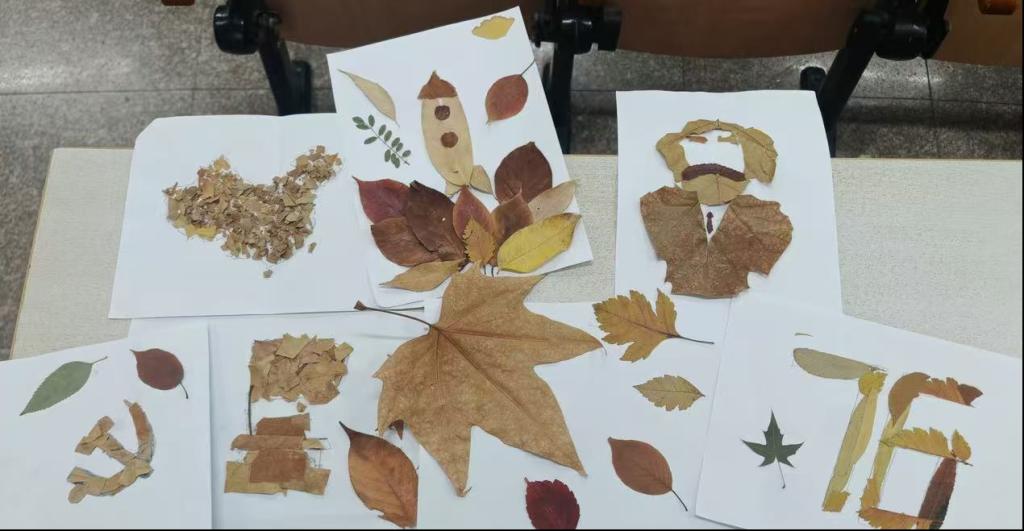 在实践环节中,各小组利用落叶等材料创作红色主题拼画,用拼画来展现内心的爱国情怀。