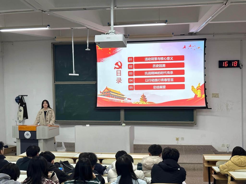活动伊始,团支书以清晰的时间轴为脉络,带领全体团员回溯14 年浴血抗战的壮阔征程。从1931 年 “九一八事变” 后的民族危亡、山河破碎,到 “停止内战、一致抗日” 的全民觉醒与同仇敌忾,再到 1937 年 “七七事变” 后全面抗战的烽火燎原,一幅幅泛黄的历史图片、一段段厚重的文字史料,生动再现了 “山河破碎风飘絮” 的民族劫难,更立体呈现了中华儿女 “万众一心、不屈不挠、浴血奋战” 的抗争历程。