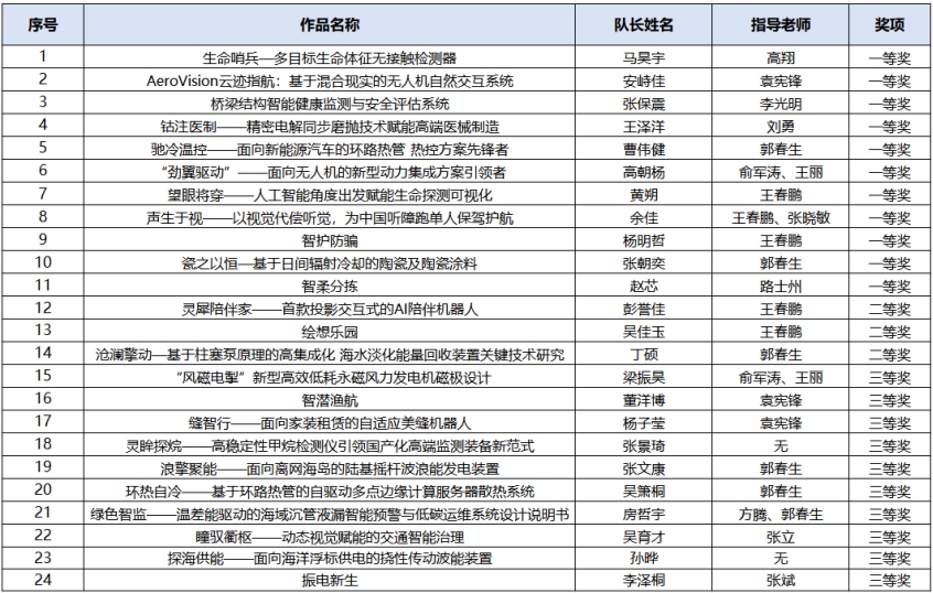 《生命哨兵—多目标生命体征无接触检测器》等8件作品获得山东赛区一等奖并晋级全国总决赛,《智护防骗》等3件作品获得山东赛区一等奖,《灵犀陪伴家——首款投影交互式的AI陪伴机器人》等3件作品获得山东赛区二等奖,《‘风磁电掣’新型高效低耗永磁风力发电机磁极设计》等10件作品获得山东赛区三等奖。