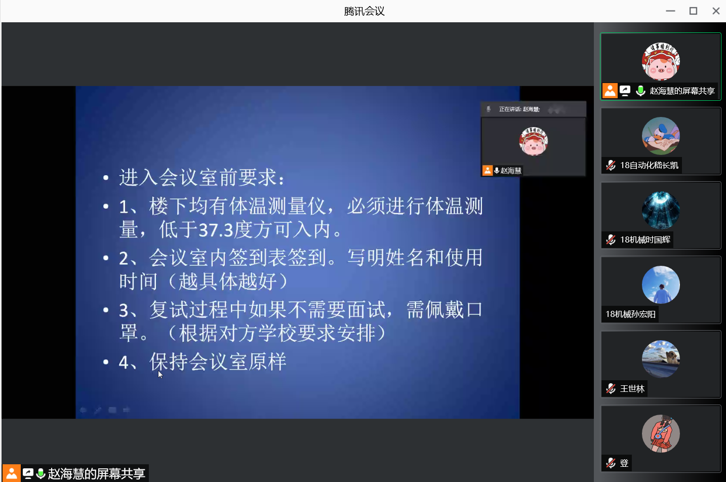会上,赵海慧老师首先介绍了学院2022届本科生参与研究生复试的基本情况,介绍预约使用面试会议室的流程,重点强调了疫情期间对同学们的要求,会议室使用期间不仅要做好复试工作,更要恪守疫情期间的要求,保障自己与他人的安全。同时,赵海慧老师对志愿者同学提出工作要求,为保障疫情期间的安全,志愿者需按时对会议室进行开窗通风和进行消杀工作。最后,孙宁老师再次强调了纪律问题,提醒参加复试的同学们严格遵守考试要求,注意细节,做好自身防护,并在提问环节针对同学们的问题进行相关解答。