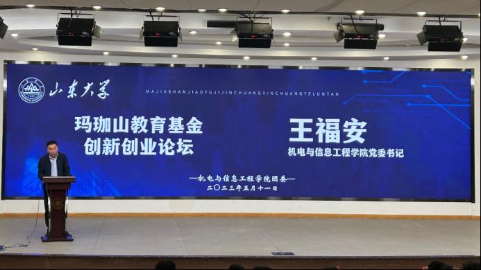 王福安在开场致辞中指出,学院以党的二十大精神为指引,从建设科技强国对人才的需求出发,积极培育大学生创新创业项目,助力科技强国建设,玛珈山教育基金是校友与学院之间深厚情感的纽带,校友们饮水思源助推学院青年学子不断勇于创新,不断追求进步,为社会发展作出贡献。王福安和孙宁共同为玛珈山教育基金创新创业论坛揭牌,标志着学院特色科创育人体系树立新里程碑。