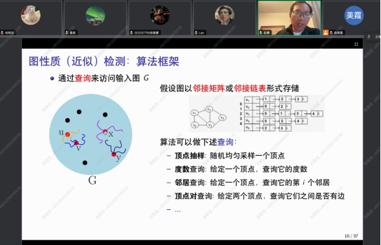 彭攀详细介绍了图的概念和大数据时代图算法面临的挑战。彭攀结合实际应用场景,按照时间和空间效率的要求,重点介绍了大规模图的三种局部算法和研究成果:第一,局部图算法在图性质检测中的应用。通过局部算法高效识别和验证复杂图结构的各种特性,为实际网络分析提供了可靠的工具。第二,局部图算法在参数估计方面的最新进展。这些算法不仅能够在亚线性时间内准确估计图中的关键参数,还能在保证效率的同时,提供理论上的可靠性。第三,局部计算算法的设计原理及其在实际应用中的效果。这些算法能够有效应对动态变化的数据结构,如搜索引擎中的关键字搜索和不断更新的万维网等场景。