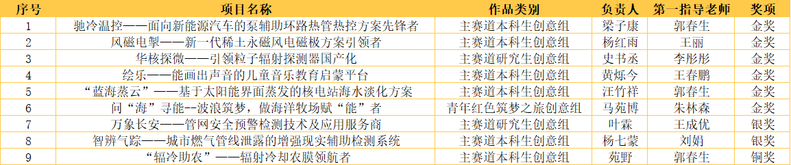 《风磁电掣——新一代稀土永磁风电磁极方案引领者》《驰冷温控——面向新能源汽车的环路热管热控方案先锋者》《“蓝海蒸云”——基于太阳能界面蒸发的水电联产海水淡化方案》《问“海”寻能——波浪筑梦,做海洋牧场赋“能”者》《华核探微——引领粒子辐射剂量仪国产化》《绘乐——能画出声音的儿童音乐教育启蒙平台》6件作品获山东省金奖,《智辨气踪——城市燃气管线泄露的增强现实辅助检测系统》《万象长安——管网安全预警检测技术及应用服务商》2件作品获山东省银奖,《“辐冷助农”——辐射冷却农膜领航者》1件作品获山东省铜奖。