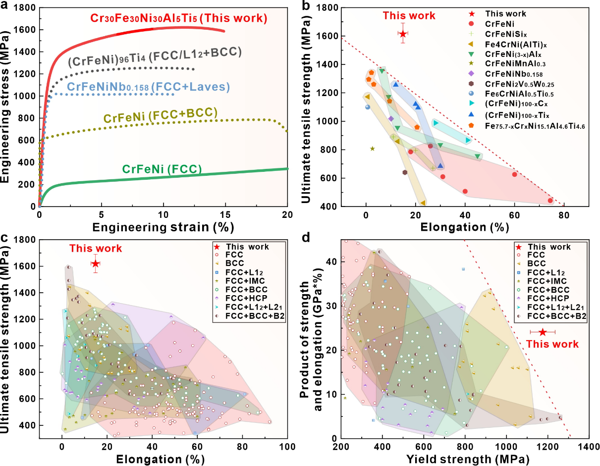 图1Cr30Fe30Ni30Al5Ti5铸态多主元合金(MPEA)与其他合金的拉伸性能对比