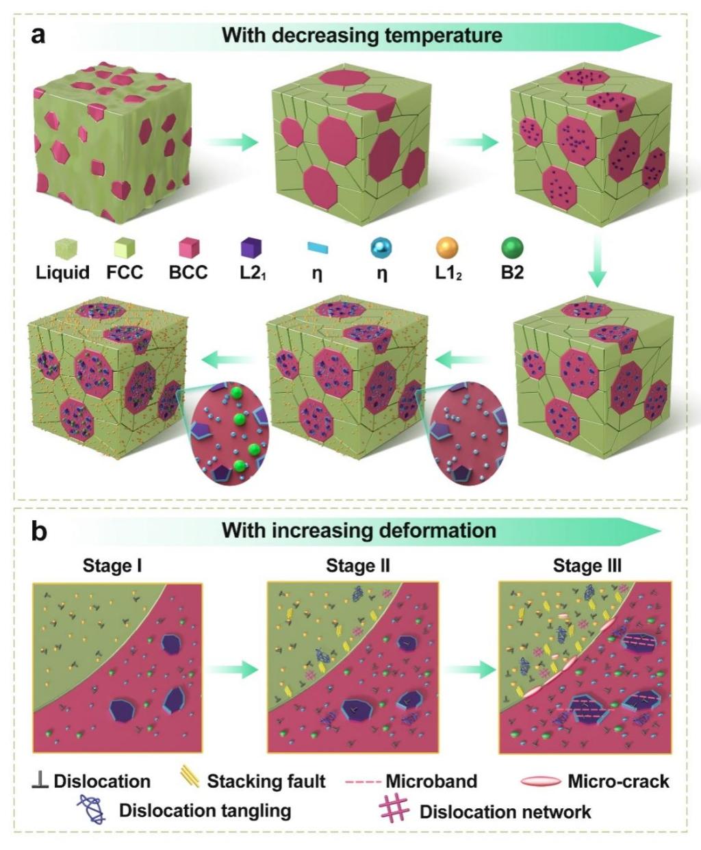 这项研究中的Cr30Fe30Ni30Al5Ti5铸态合金展示了复杂的多级异质结构。具体而言,微米级的BCC晶粒分布在连续的FCC结构框架中,FCC基体内形成了L12型有序纳米析出物,而BCC晶粒内部则析出了亚微米级的核-壳结构的相以及η相和B2相等纳米级析出物。在变形过程中,这些多尺度析出物通过复杂的协同作用,诱导出大规模的位错网络和层错结构,赋予了材料在高应变硬化行为下仍具备优异的强度和塑性。该合金的显著特点是无需经过复杂的多步骤热处理或冷/热加工即可获得优异的性能表现。相较于传统的锻造合金,这种新型的铸态多主元合金以更为简便的制造工艺实现了高性能的突破,展示了铸造工艺在先进材料开发中的巨大潜力。