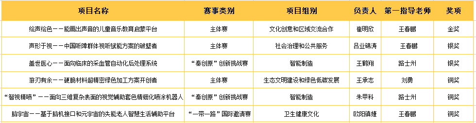 《绘声绘色——能画出声音的儿童音乐教育启蒙平台》获国家金奖,《声形于视——中国听障群体视听赋能方案的破壁者》《盖世医心——面向临床的采血管自动化后处理系统》获国家银奖,《游刃有余——硬脆材料超精密绿色加工方案开创者》《“智视精喷”——面向三维复杂表面的视觉辅助套色精细化喷涂机器人》《脑宇宙——基于脑机接口和元宇宙的失能老人智慧生活辅助平台》获国家铜奖。