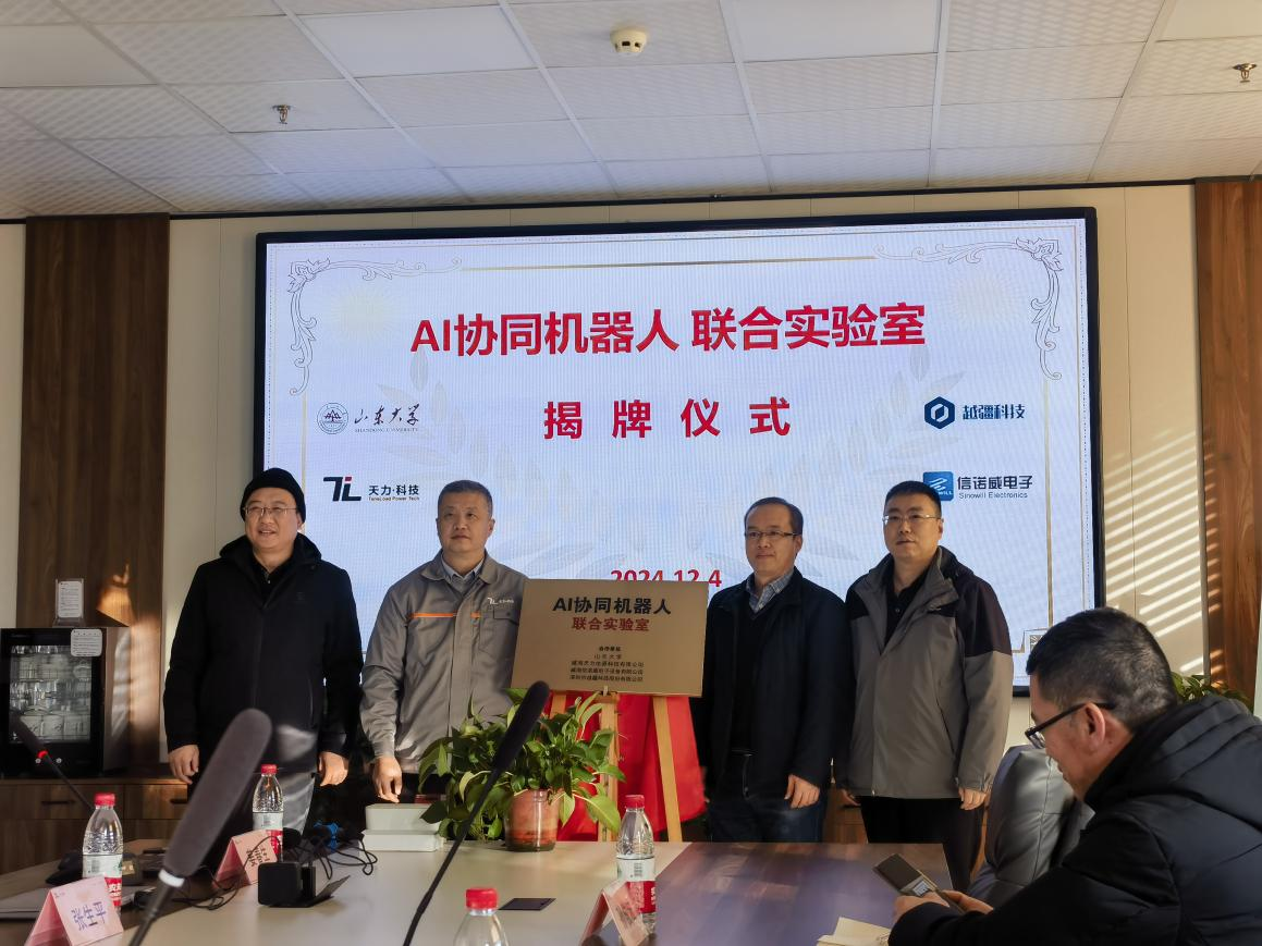 12月4日,机电与信息工程学院与校友企业在天力电源科技有限公司联合召开AI协同机器人联合实验室启动会议。威海天力电源科技有限公司董事长位世波,深圳市越疆科技股份有限公司工业事业部华北区总监刘化亭,信诺威电子设备有限公司总经理陈志军,机电与信息工程学院副院长宋勇出席会议,会议由威海天力电源科技有限公司副总经理姜春生主持。