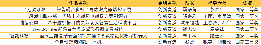 《‘无烲可激’——智能耦合多相半导体激光器热控系统》《风磁电掣——新一代稀土永磁风电磁极方案引领者》《脑语心声——基于脑机接口的失能老人智慧生活辅助平台》获国家一等奖,《AeroPointer近场自主多旋翼飞行器交互系统》《‘智绘科技’——面向三维复杂表面的视觉辅助套色精细化喷涂机器人》获国家二等奖,《全自动热熔划线一体机》获国家三等奖。