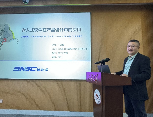 12月6日,新北洋公司高级工程师丁进峰,以“嵌入式软件在产品设计中的应用”为题,重点介绍嵌入式工程师的职责以及如何成为一名嵌入式工程师,讲座通过理论联系实际,将大学的课程与工作中的应用结合起来,完整构建了嵌入式开发的学习框架。