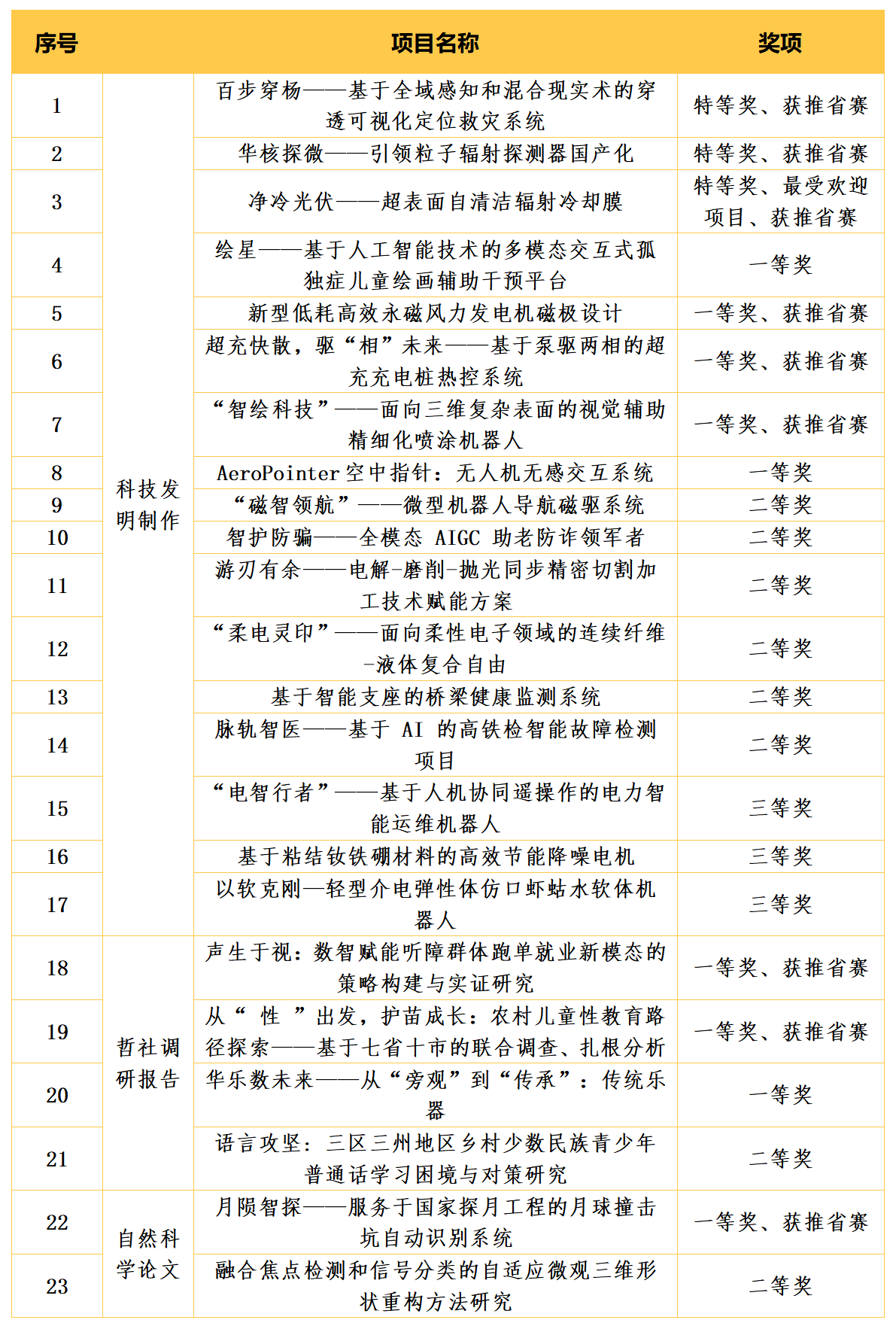 近日,校区第十九届“挑战杯”大学生课外学术科技作品竞赛落下帷幕。机电与信息工程学院喜获奖项24项,其中特等奖3项,一等奖9项,二等奖8项,三等奖3项,《净冷光伏——超表面自清洁辐射冷却膜》被评选为“最受欢迎项目”,并有9个项目获推进入省赛。