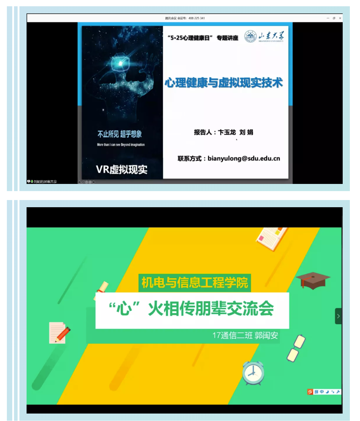 学院守正创新,结合专业特色和疫情期间心理调适需要,继续推出“五个一”系列活动,主要包括听一场心理与专业碰撞的讲座、开一次朋辈交流分享会、看一部心理电影、做一顿丰盛晚餐、寻一个微笑瞬间等。在“心”语师说讲座中,计算机系优秀青年教师刘娟、卞玉龙以“心理健康与虚拟现实技术”为主题,围绕计算机辅助的心理与行为、学校VR实验室的交互工作、自主研发的混合现实自闭症儿童认知康复训练系统的项目现状等方面展开交流,重点介绍了VR技术在心理学上的广泛应用,将心理知识与计算机专业知识巧妙结合,普及心理健康知识,开拓了同学们的眼界,激发了同学们的学习兴趣;在“心”火相传朋辈交流会上,2017级优秀学生郭闽安从考研、就业、保研三方面分享感受体会、互动答疑,帮助低年级同学树立规划意识,确定大学目标;在“影动我‘心’——看一部心理电影”活动中,学生们被主人公“1900”那份对梦想的热爱与执着、滴纯粹朴素的人生观和价值观的坚守而感染,表示踏实坚守、奋发向上,积极发挥自己的聪明才智,努力实现自我价值;活动期间,学院组织了“烹燃‘心’动——做一顿丰盛晚餐”与“微笑‘心’晴——寻一个微笑瞬间”两项创意作品大赛,鼓励同学们用镜头记录下居家学习的课余生活,发现生活中的“小确幸”。