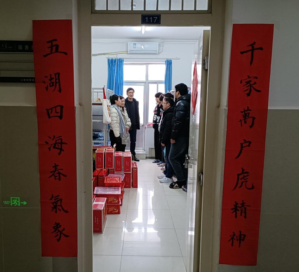 在学生宿舍,学院领导与留校学生亲切交谈,询问学生们在校学习生活情况,嘱咐学生们要严格按照疫情防控要求,做好个人防护,科学合理安排生活,加强体育锻炼,积极参与学院组织的“拼自律,强体魄,迎冬奥”线上体育活动,度过充实有意义的假期;提醒学生们学院每日都有值班人员职守,时刻关心关注留校学生的情况,如果有任何问题都可以寻求老师的帮助;同时学院领导也向学生们传达了新年的祝福,祝愿学生们在新的一年学业有成、幸福安康。留校学生们对老师们的亲切慰问纷纷表示感谢,并表示将会继续严格遵守学校的规章制度,认真学习,积极锻炼,在校期间让家长安心,让老师和学校放心。同学们还热情地向老师们展示了大家自行书写的春联,“五湖四海春气象,千家万户虎精神”,展现了同学们对新的一年学习生活的憧憬和追求。