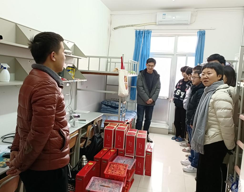 1月31日上午,机电与信息工程学院党委副书记李冶、孙宁,团委副书记赵海慧一行到学生宿舍走访慰问假期留校学生,了解留校学生的学习生活情况,为留校学生送去新年祝福和关怀。