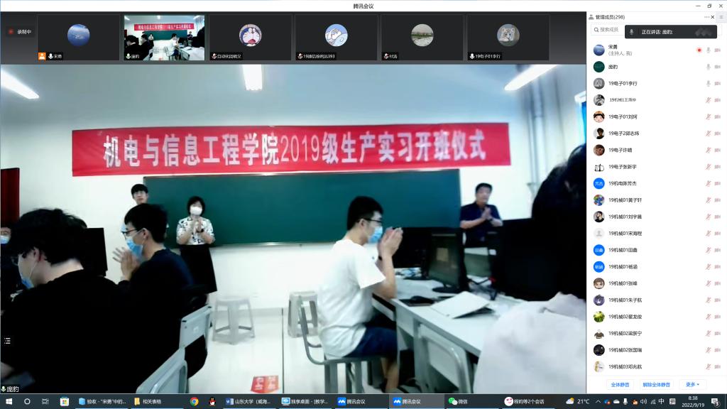 9月19日,机电与信息工程学院举行2019级本科生生产实习开班仪式,威海校区副校长刘海,威海市天罡仪表股份有限公司董事长付涛,学院常务副院长、党委副书记王丽,天罡仪表工程师邢天宇,部分生产实习负责老师,及2019级本科生通过线下+线上方式参加了开班仪式。开班仪式由副院长郭春生主持。