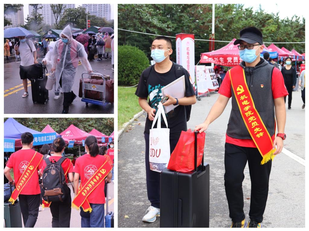 迎新现场的党员先锋服务队成员们身披绶带,佩戴党徽,努力减轻雨天对迎新工作的不利影响,以饱满的热情迎接前来报到的每一位新生,主动为新生讲解报到流程,热心帮助新生搬运行李,耐心答疑解惑,为新生入学开启了温暖的大门。此外,学院在迎新摊位附近设置党建宣传展板,介绍学院党建品牌活动,展示先锋榜样事迹,让新生更加真切地感受到先锋榜样的力量。