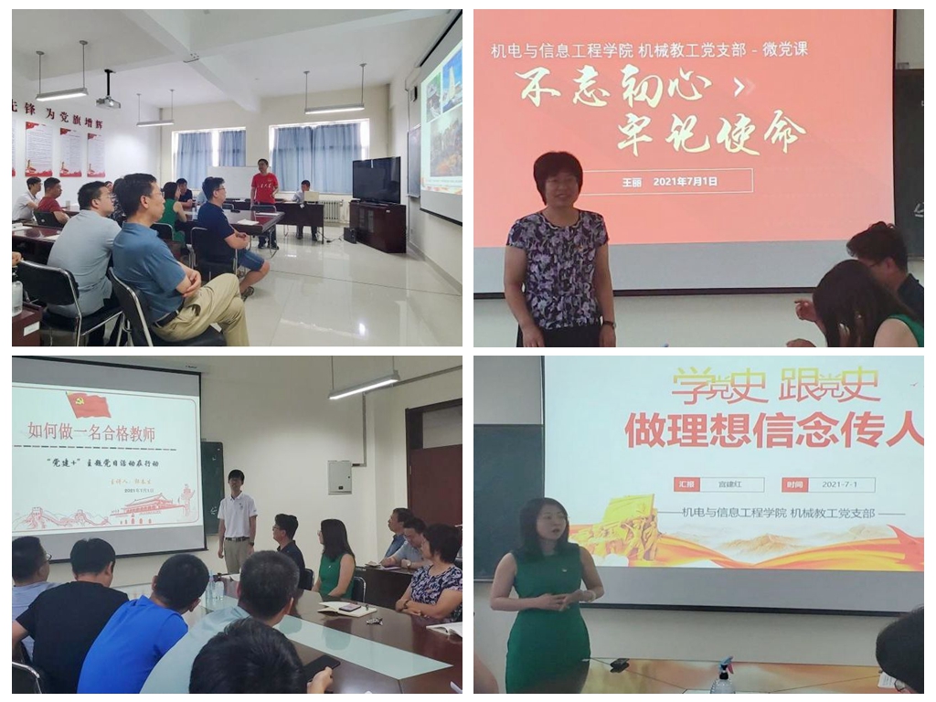 在建党100周年之际,为扎实推进党史学习教育,提升支部党员的党性修养,牢固树立“不忘初心、牢记使命”的理想信念,根据学校《关于庆祝中国共产党成立100周年组织开展“永远跟党走”群众性主题宣传教育活动的通知》等有关文件精神,7月1日上午,机电与信息工程学院机械系教工党支部在知行南楼201B会议室组织集体观看庆祝中国共产党成立100周年大会直播,并开展“小微党课我来讲”活动。学院党委书记彭兆强,学院常务副院长、党委副书记王丽,机械系教工党支部全体党员参加会议。活动由机械系教工党支部副书记宫建红主持。