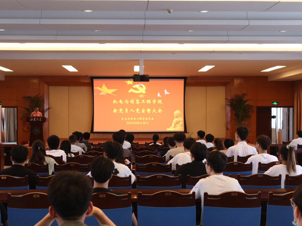 6月30日下午,机电与信息工程学院在知行南楼六楼多功能会议室举行新党员入党宣誓大会。学院党委书记王福安,党委副书记李冶、孙宁,94名新发展党员,老党员代表和全体学生党支部书记参加此次大会。宣誓大会由李冶主持。