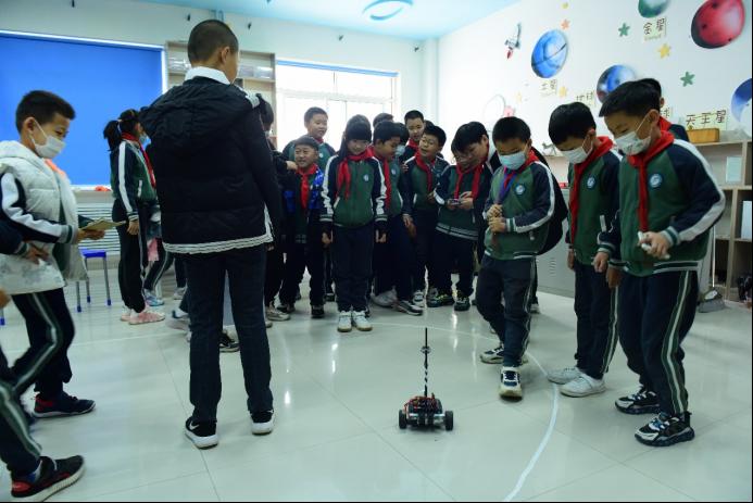 为加强学生党员志愿服务先锋模范作用,发挥学院专业社团科技优势,机器人与电子设计协会在威海市智能制造协会协助下,以学院双创基地为平台,辐射带动威海市中小学生展开科技创新进校园系列活动,面向中小学生普及机器人和人工智能等前沿知识,激发孩子们的想象力和创造力。4月6日,协会与高区后峰西小学联合举办“科普进校园”主题智能车科普活动,活动由机器人与电子设计协会辛宝庚、徐志超、王圣文主讲,学院党委副书记孙宁、团委书记赵海慧、学生社团工作分管教师邢晓璇出席本次活动。