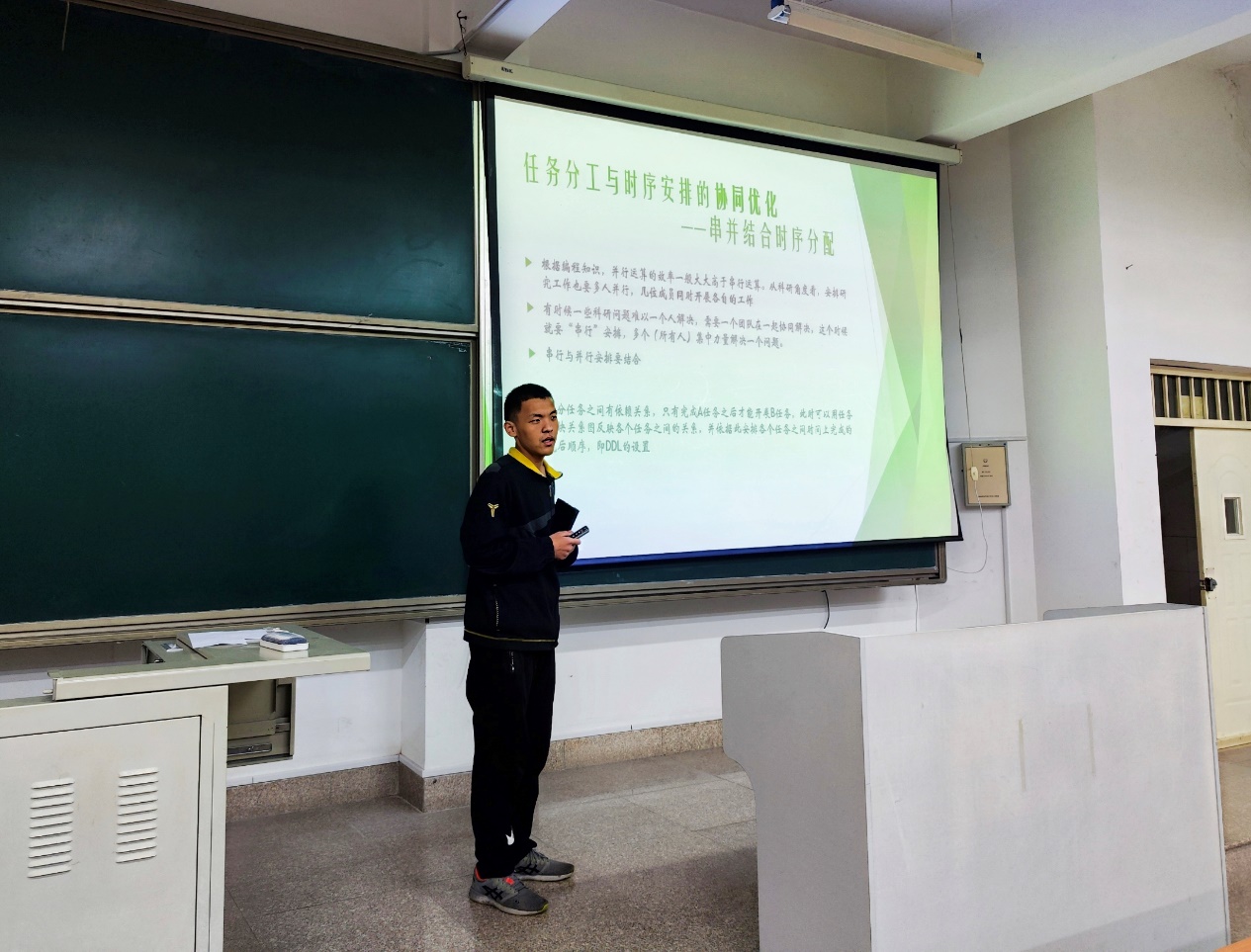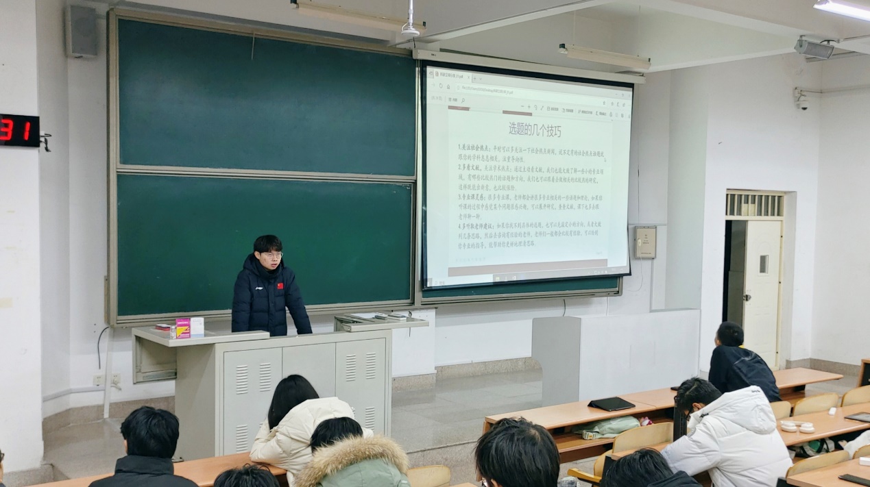 在交流分享环节,梁子康从个人参赛经历出发,分享了进行科研选题的技巧,着重强调了选题的立意应当贴合社会热点与需求。梁子康建议同学们在taptap(点点)网址的过程中多查阅文献,积极听取老师的建议,及时修改项目中存在的问题。他还以本团队的项目申报书为例,深入讲解了撰写项目申报书的方法与技巧,突出强调了申报书在科研比赛中的重要作用。王鹤翔强调了任务拆分、时间控制与整体协同的重要性,他结合自身参加项目经历,详细阐述了团队在科研过程中优化时间安排的方法,分享了一些科研实践过程中的项目推进技巧。王鹤翔指出,同学们在科研道路上要做好充分的工作,积极寻找解决困难的办法,持续完善与打磨团队项目,才能不断取得新的突破。