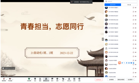 2021级自动化01、02班团支部以线上方式联合开展本次活动。采用PPT讲解、视频播放、主题讲座、志愿者经验分享和志愿成果展示等多个环节。通过对主题“青春担当,志愿同行”的讨论和思考,同学们更加深刻地认识到志愿服务不仅是奉献爱心的行为,更是一种社会责任和担当。