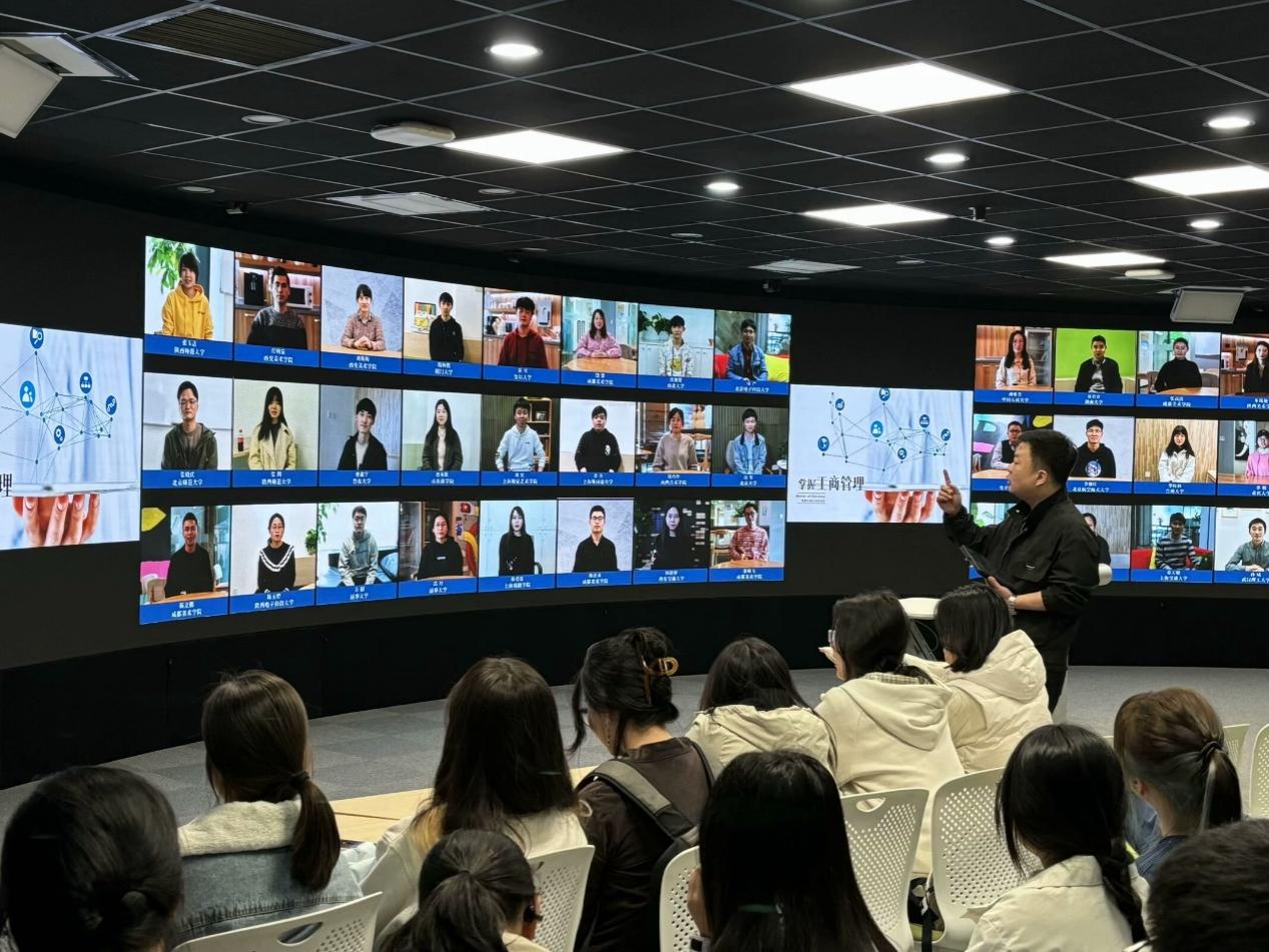 在华为数通拔尖人才创新实践基地参观环节,彭鹏老师详细介绍并演示了全景教学空间的Live教学、360°实境教学、VR教学、小组教学、同步课堂等多种教学模式。通过结合空间系统和常规教学操作的介绍,直观形象地展现了该基地作为学院创新性校企合作人才培养体系的重要载体,在深入推进产教协同、主动服务国家战略方面的生动实践。在基地实习的两位大四学长陈佳鹏、刘睿超分享了参与基地实习项目的所学、所思、所得。他们表示,基地高质量的实习实践平台为同学们求职华为、申请出国和积累工作经验提供了重要支撑,鼓励同学们加入华为基地参与项目,锻炼提升自己。