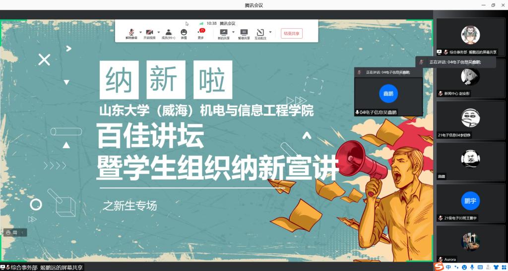 为了落实学校在疫情期间的相关防疫政策,本次会议采取线上的方式进行,团学组织和党建服务中心同时举办了三场会议分别面对21级不同专业的新生们。会议伊始,李华杰、朱鹏阳和赵泽洋三位学长分享了自己的科研经历,鼓励广大21级新生认真学习理论知识,提高自己的思考能力,积极参加学校举行的各类科研活动,不断提升自己的实操能力,将所学理论与实践操作相结合,同时三位学长也表示,参加科研活动和学生工作时一定要处理好这些事务与专业课程学习的关系,不能因为参加科研活动而忽视了专业课程的学习;朱鹏阳学长建议新生们在大学生活中要提高自控能力,做好自己的时间安排;赵泽洋学长指出,新生在大一一定要培养好自己的学习习惯,做到今日事今日毕,同时做好工作备忘录,及时查漏补缺;李华杰学长建议新生们要培养自己的沟通交流能力,处理好自己的人际关系。百佳讲坛的经验交流会结束后,来自机电与信息工程学院团学组织和党建服务中心的16个部门依次进行纳新宣讲,各个部门的负责人通过PPT和视频的形式向新生介绍自己部门的特点,同时鼓励新生们积极参加学生工作,锻炼自己的能力,丰富自己的大学生活。