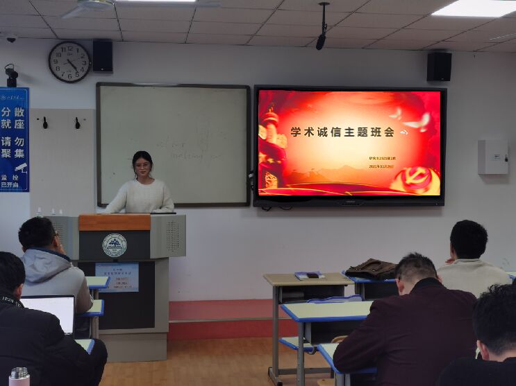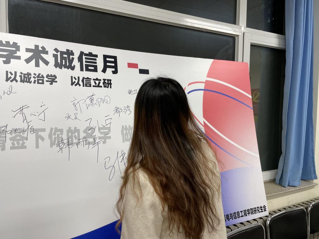 11月17日,举办“以诚治学,以信立研”专题讲座,由副教授王成优担任主讲人。王成优强调,在科研中做到“洁身自好”,才能在求真求实的学术之路上越走越远。11月19日,机信学院研究生会组织学术诚信座谈会,研会副主席马倩分享了她对于学术诚信的理解与认识,普及了相关研究生学术诚信的内容,会后参会成员纷纷在海报上签名以表达“坚持学术诚信”的决心。与此同时,各班级纷纷响应号召,开展“普及学术诚信知识,加深学术诚信理解”主题班会,在相互交流中进一步了解深入学术诚信,将其内化于心,在今后的科研中恪守学术道德。线下活动进行的有声有色,线上宣传也紧随其后,制作学术诚信科普推送、线上调查问卷,了解研究生对学术诚信的学习认知程度。