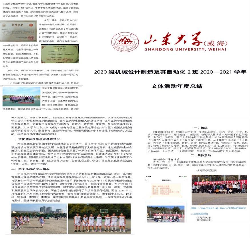 该活动面向19至21级所有班集体,各班级以图文总结的形式展示本学期开展的体育锻炼活动和特色美育文化活动,同时采用量化分数的形式考核班级本学期文体活动的参与情况及获奖情况,对在考核中表现突出的班级给予“文体活动先进班级”荣誉称号。本学年多彩的文体活动丰富同学们的校园生活,引导更多的学生走出宿舍、走向操场、走入集体,增强同学们参与文体活动的积极性,提高同学们的文化素养,有助于营造良好的大学校园艺术审美氛围,展现了具有学院特色的美育文化建设体系。