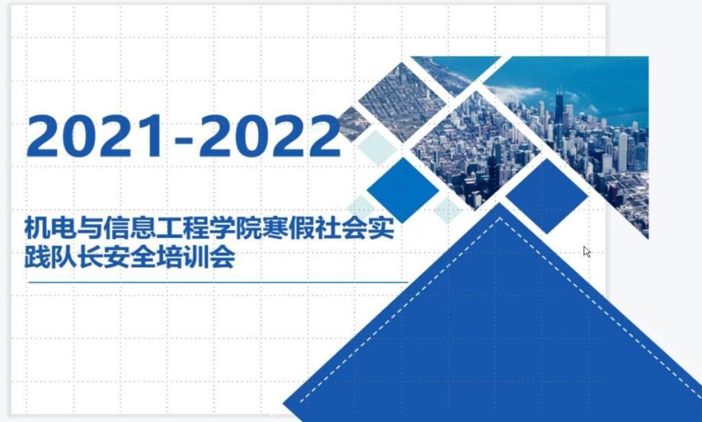 为落实疫情防控相关要求,保证寒假社会实践活动安全开展,同时帮助同学们深入了解实践报告撰写等相关事宜,1月11日下午三点,机电与信息工程学院通过腾讯会议举办2022年寒假社会实践安全培训会。本次会议由赵海慧老师和社会实践部负责人李鑫淼主持,各社会实践团队代表参与。