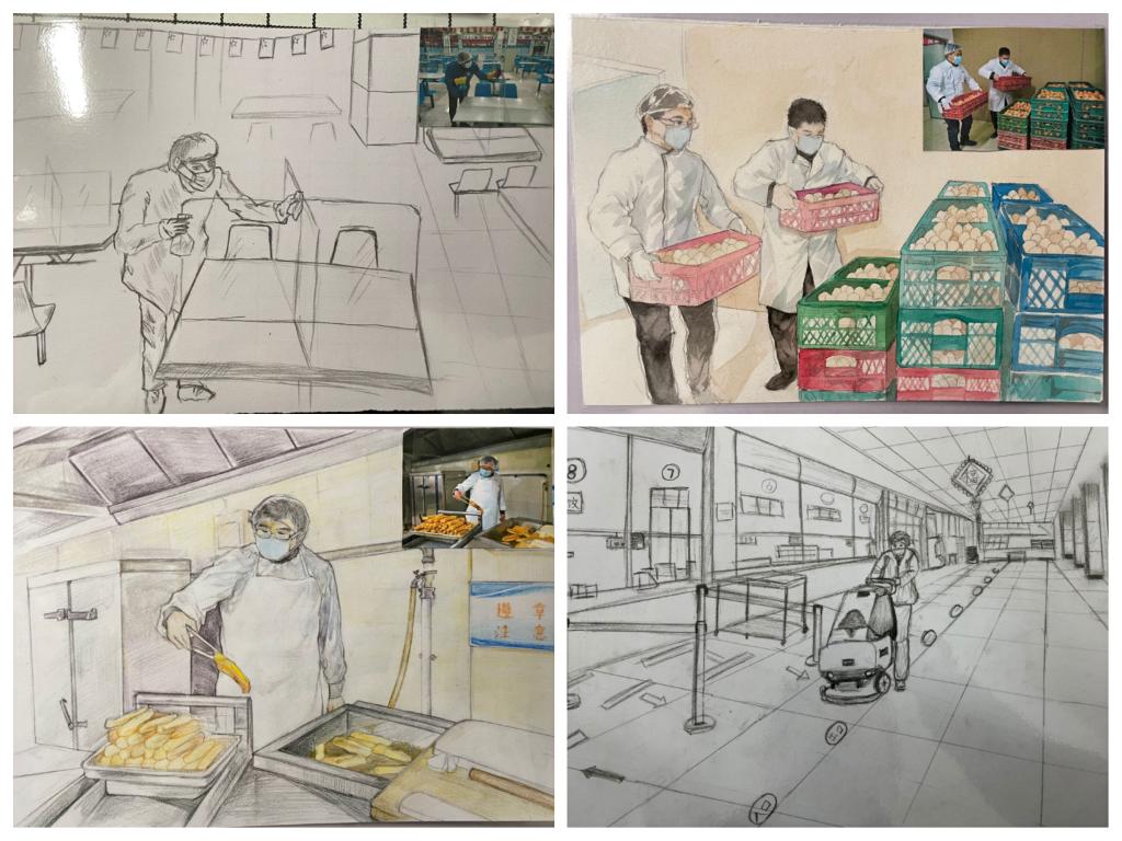 活动得到了同学们的积极响应,共收集到40余份作品,同学们发挥个人特长,利用编织、剪纸、折纸、贴画、绘画速写等多种形式,充分利用现有资源,或设计裁剪,或笔墨寄情,精心设计制作一件件别出心裁的手工作品,通过作品描绘出一线人员工作的生动瞬间,以手传情,再现校园里最美的“风景”,表达了同学们对老师、志愿者、后勤职工、宿管阿姨等人员的真诚感谢和崇高敬意。当同学们将自己亲手制做的作品送给一线工作人员时,那一张张的笑脸记录了这个春天里校园别样的温暖和感动。