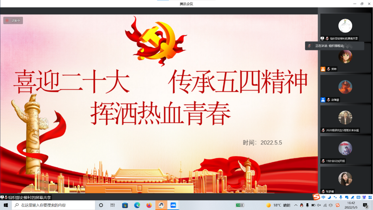 在赵海慧老师结束讲话后,由团委组织部干事程诺主持,从“传承五四精神,挥洒热血青春”和“喜迎二十大,永远跟党走”两个方面进行一系列科普和讲解,其中播放了两段视频,分别是由学院团委组织部和团委新媒体中心联合拍摄制作的一期”青年大学习“精品视频以及中央广播电视总台拍摄的一段迎接二十大宣传片。在本次宣讲会活动中,大家共同学习了五四精神的内容和时代内涵,学习了有关党的二十大的具体内容。