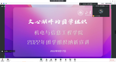 为帮助22级新生了解学院团学组织,展现各部门风貌,9月17日晚,机电与信息工程学院举办团学组织纳新线上宣讲会。团学组织主席团成员,各部门负责人,2022级新生参与此次会议。