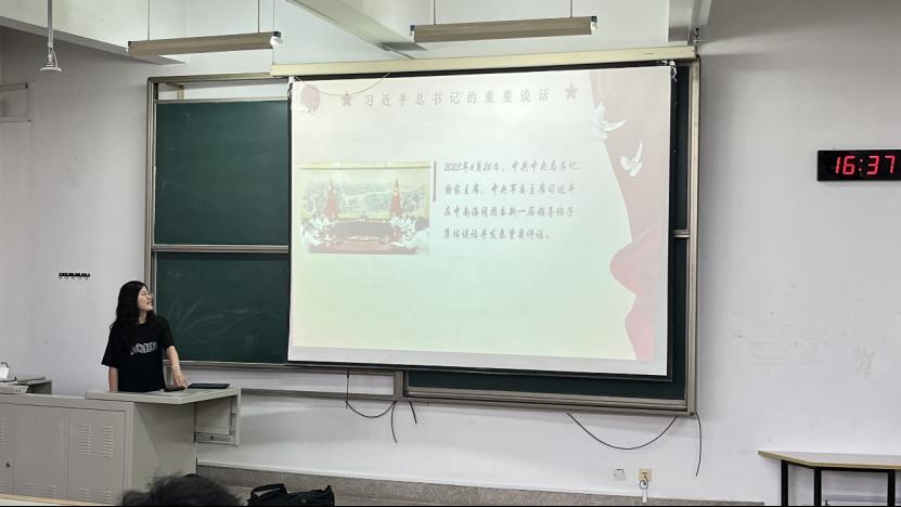活动伊始,团支书狄蕊为同学们讲解了习近平总书记在同团中央新一届领导班子成员集体谈话时的重要讲话精神的内涵和意义。通过一段新闻视频阐明习近平总书记重要讲话精神即:党的事业后继有人,殷切寄望青年一代;立足中华民族伟大复兴战略全局和世界百年未有之大变局,指导擘画新时代共青团和青年工作。随后,狄蕊从牢记嘱托,团结奋斗层面出发,鼓励同学们立鸿鹄之志,做奋斗者,努力成长为能吃苦,有担当,肯奋斗的新时代青年,为实现中华民族伟大复兴贡献自己的力量。她强调,每个人的前途命运都与国家和民族的前途命运紧密相连,实现中华民族伟大复兴是一项光荣而艰巨的事业,广大青年应为强国建设、民族复兴伟业挺膺担当。