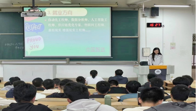 会议伊始,张诣甜通过一个五分钟的互动环节引入,邀请同学们在纸上写下了自己大学期间的目标,同学们积极参与并主动交流,反响热烈。随后,张诣甜对生涯规划的意义进行了总结,并用两个视频介绍了智能制造工程专业的前景,最后向同学们介绍了职业生涯规划书的撰写。