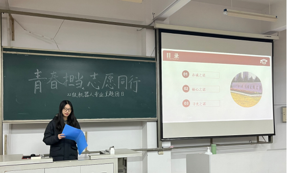 为深入学习贯彻党的二十大精神,落实习近平总书记关于志愿服务系列重要指示精神,激发同学们的志愿服务热情,培养同学们的奉献精神和社会责任感。12月12日晚,22级机器人工程1、2班于商学院447顺利开展“青春担当,志愿同行”主题团日活动。本次活动由机器人1班团支书胡靖豪和机器人2班团支书李心语主持,本专业全体同学参加。