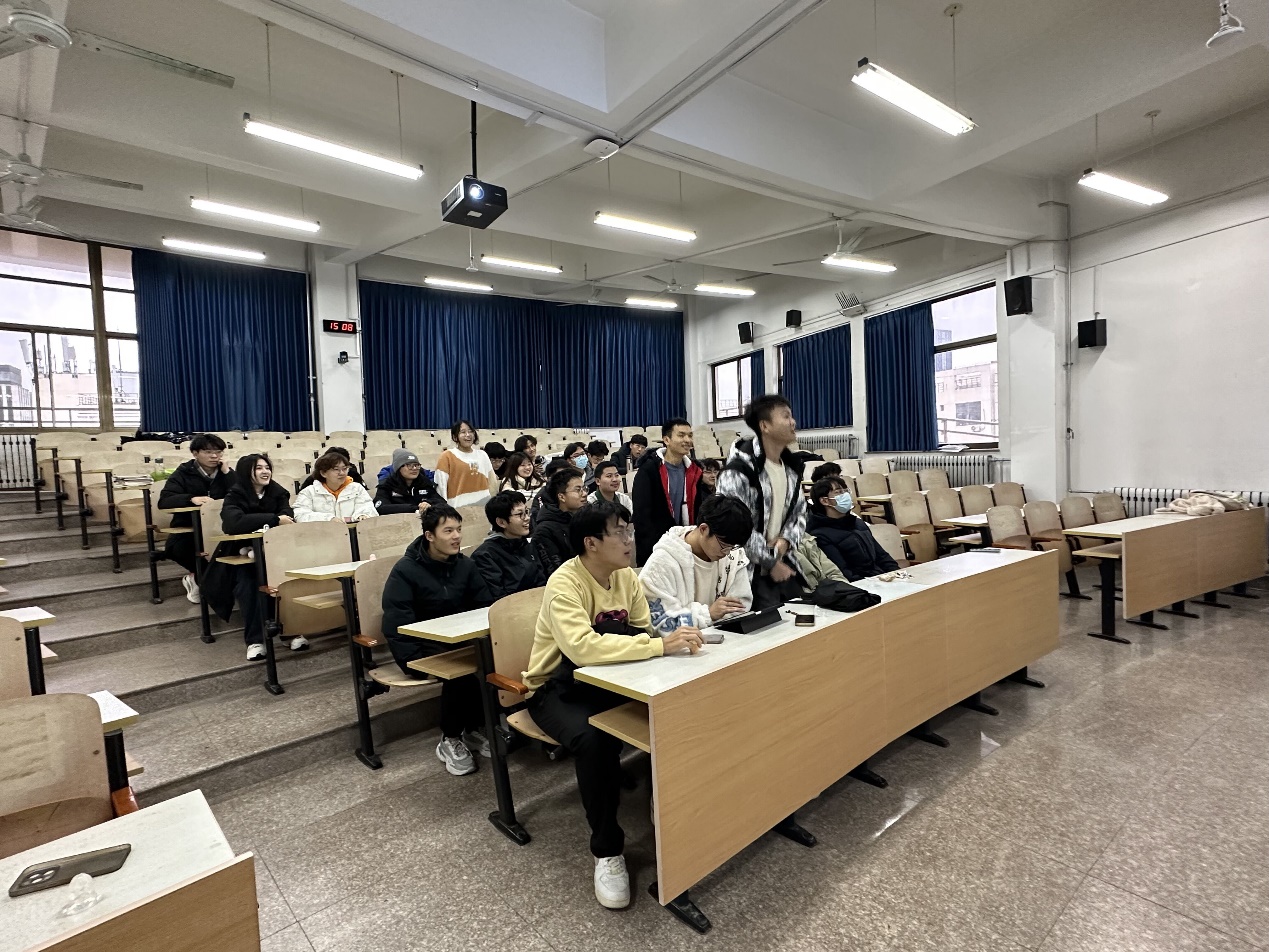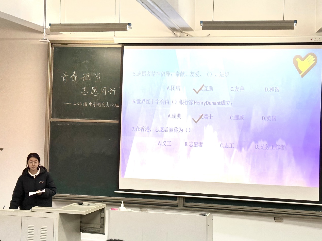 活动伊始,团支书李靖如带领全体成员齐唱团歌,学习前言部分,引出此次团日活动主题——“志愿服务”。随后通过观看一段新闻短片,同学们了解到了形式多样的志愿服务活动,包括环保知识走进社区,利用AI图像修复技术助力寻找走失孩子,科学知识走进校园等,同学们更加清晰地感受到志愿服务在社会各方面所发挥的积极作用。随后,李靖如同学举行知识竞答小游戏,活跃了现场气氛,同学们积极踊跃回答问题,收获了丰富的关于志愿服务的知识。