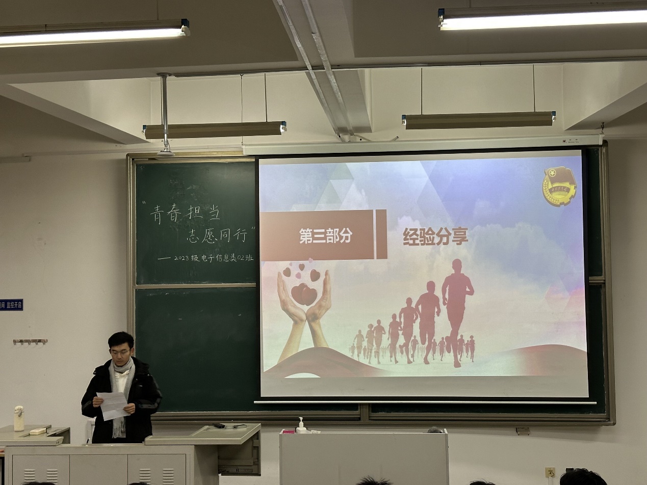 12月11日下午,2023级电子系02班在商学院558教室开展了“青春担当,志愿同行”主题团日活动。本次活动邀请党建服务中心组织部副部长孙希灿进行经验分享。