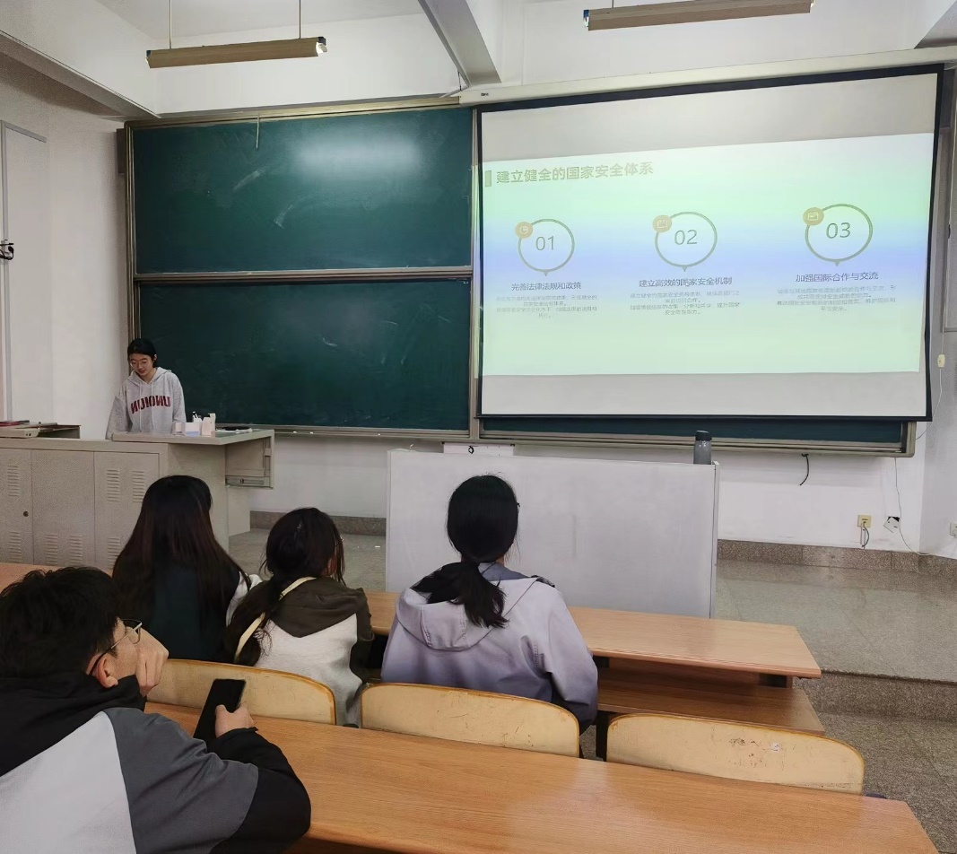 活动伊始,李靖如同学向大家介绍了国家安全的背景与意义。她强调,国家安全是国家生存和发展的基石,是维护社会稳定、保障人民福祉的重要前提;同时,国家安全也是全球和平与稳定的重要组成部分。在当前国际形势下,国家安全面临着诸多挑战,因此,守护国家安全显得尤为重要。