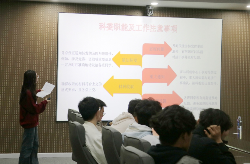 此前,学院通过个人申请、笔试考核、试讲考核等选拔出八位科研创新成果丰富的高年级同学担任2024新生科研班主任。本次科班科委见面会的成功举办,为科班科委之间搭建了沟通的桥梁,进一步规范了科研班主任工作,为新生科研创新工作的开展打下了良好基础,为学院创新创业工作注入了新的活力。