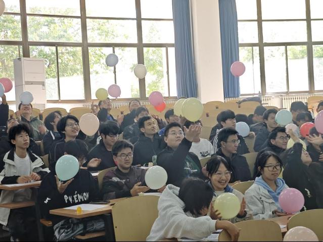 “气球游戏”分为两轮进行。第一轮中,大家被分成若干小组,每组需合作不让气球落地,但不能通过语言沟通。游戏开始后,大家只能依靠眼神和手势配合,显得手忙脚乱,气球频频掉落,场面既紧张又有些混乱。在第二轮中,允许小组成员通过言语进行沟通。通过讨论策略,分配任务,各组同学配合默契,气球保持在空中的时间显著延长,场面充满了欢声笑语。游戏结束后,徐静怡引导大家反思并总结,大家一致认为有效的沟通使得彼此能够更好地理解对方的想法和需求,合作起来更加顺畅,从而也达到了更好的结果。