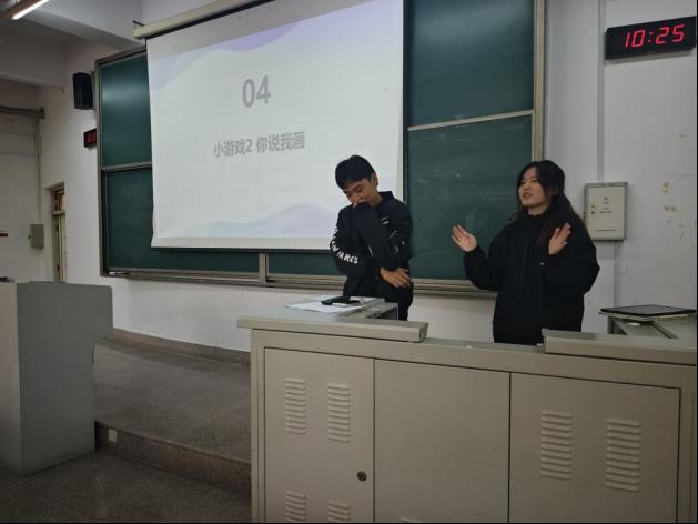 接下来,心理委员带领大家进行了“你说我画”的游戏。台上一名同学用语言描述自己手中的图片,其他同学根据描述进行绘画。游戏过程中笑声不断,场下同学们有时因为描述不够清晰,画出的图形与原图相去甚远,有时则因为描述精准,绘画成果十分接近,赢得了全场的掌声。通过这一活动,同学们意识到清晰、具体的沟通对于信息传递的准确性至关重要。