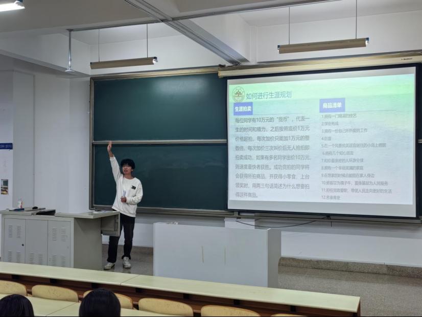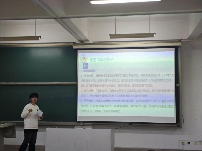 在班会正式开始之前,周广扬带领同学们进行了“击鼓传花”、“逢4就过”两个热身小游戏。在充分调动起同学们的积极性之后,生涯班会正式开始。首先,周广扬向大家讲述了张三和李四(均为化名)两位同学的大学故事以及截然不同的人生走向,生动地展现了合理的生涯规划对于个人发展的重要意义。
