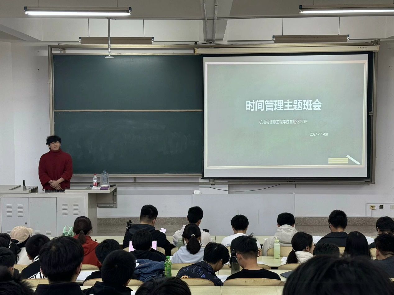 为培养大学生的时间管理意识、更好适应大学生活节奏,11月9日下午,机电与信息工程学院自动化02班在学院楼553室召开主题为时间管理的心理班会。班会以直观的方式让同学们了解时间管理的重要性以及如何进行合理时间规划。研究生学长李振出席活动,本班心理委员龙江锦主持会议,24级自动化类02班全体同学参与会议。