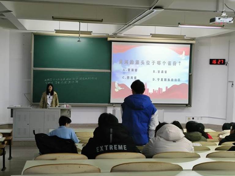 之后,活动进行到有奖竞答环节。庞博冉就黄河流域提出一些问题,问题都来自于课堂内容,由同学们抢答。同学们热情响应,积极回答。问答环节之后,庞博冉为同学们播放了一段讲述“黄河故事”的视频,阐释了为什么要保护黄河,怎样保护黄河。