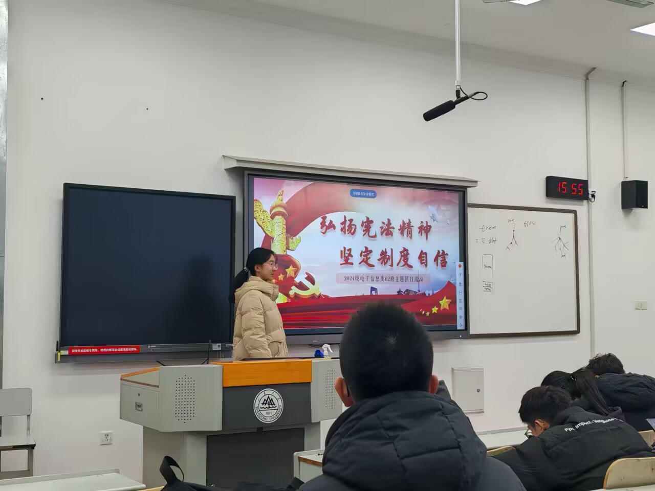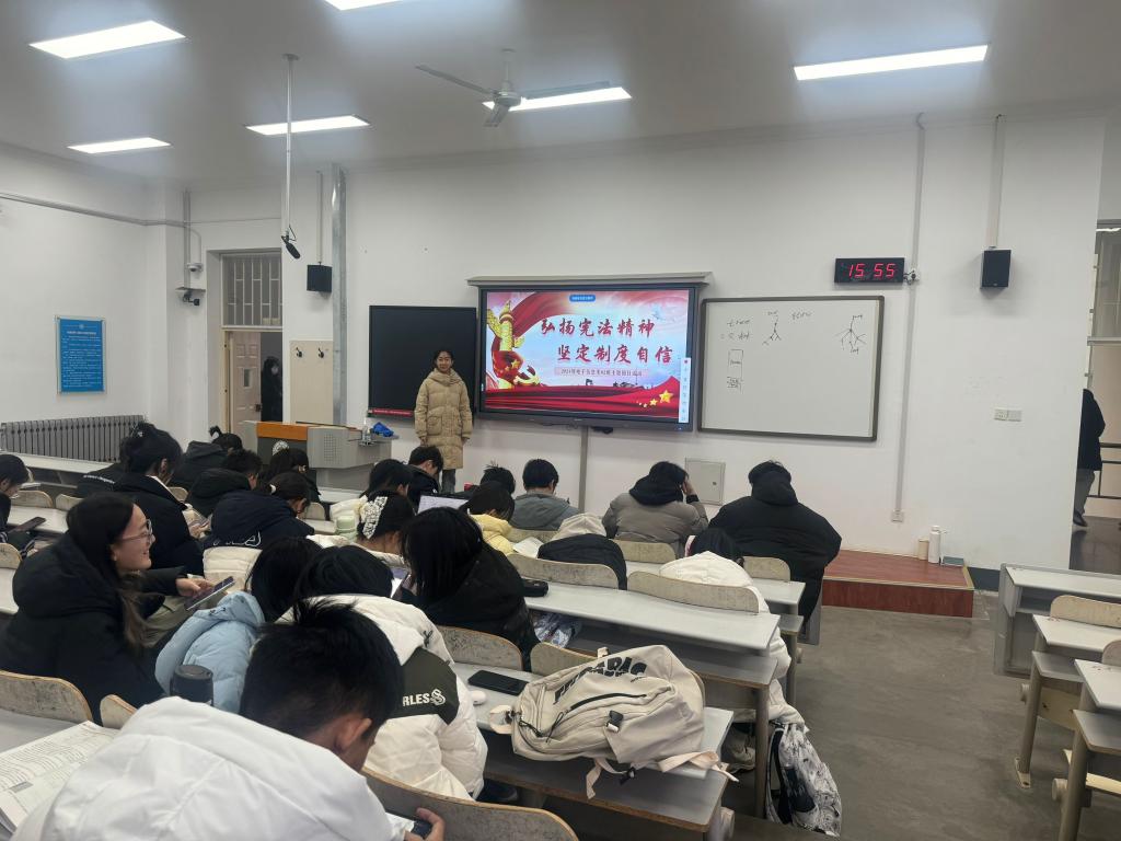 为学习贯彻习近平法治思想,引导团员和青年学习宪法知识,弘扬宪法精神,维护宪法权威,推动宪法实施,做宪法的忠实崇尚者、自觉遵守者、坚定捍卫者,为中国特色社会主义法治建设注入青春力量,24级电子02班于2024年12月17日下午四时于图东317成功举办了“弘扬宪法精神,坚定制度自信”主题团日活动。本次活动由团支书宋欣彦主持,24电子02班全体同学参加。