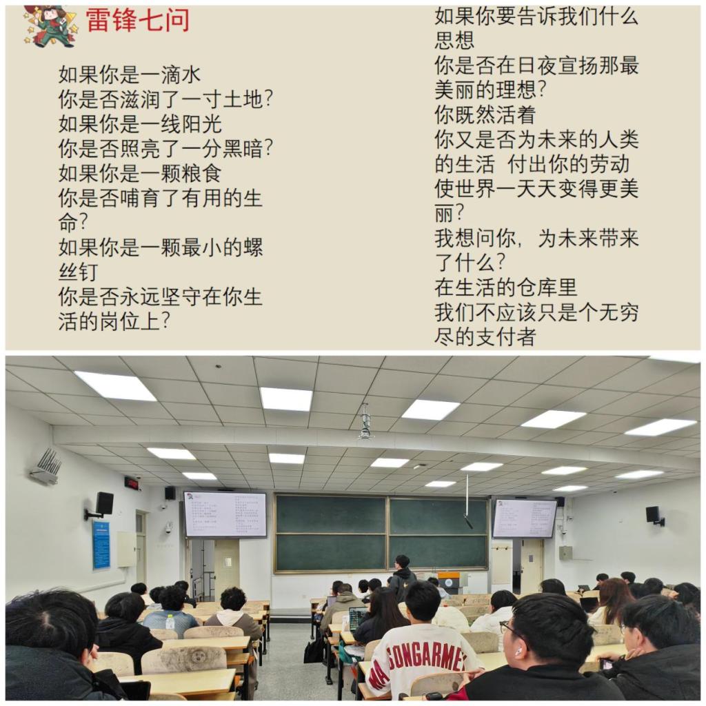 诠释新时代雷锋精神,传递温暖力量在新时代,雷锋精神被赋予了更为丰富的内涵。为了让同学们更好地理解这一精神在当下的体现,活动特别邀请了“微光・炬火”支教团负责人进行分享。负责人通过录制视频的形式讲述了支教团深入偏远山区,为孩子们带去知识与希望的经历。在艰苦的教学环境下,支教团成员们克服重重困难,为山区孩子打开了外面世界的窗户。他们用自己的微光汇聚成炬火,点亮了孩子们的未来。这正是雷锋精神中无私奉献与关爱他人的生动写照。
