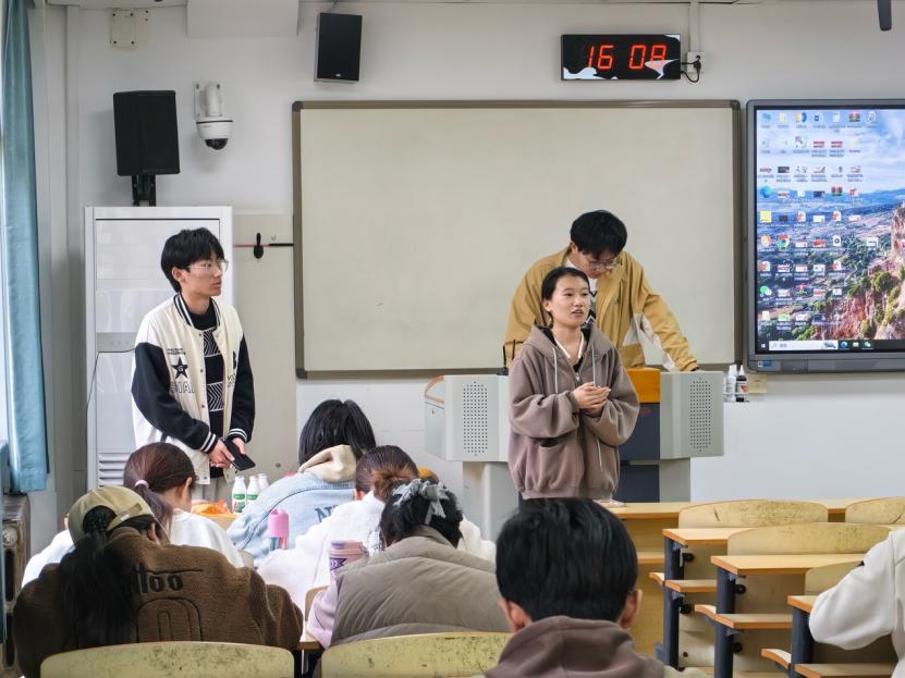 班会伊始,心理委员王伊诺以“学会与情绪共处”为切入点,结合大学生常见的情绪困扰,强调了情绪觉察与表达的重要性,并介绍了“第三方视角”“深呼吸”“以‘我’为中心阐述情绪”“情绪重评”四步管理法,为后续活动奠定理论基础。