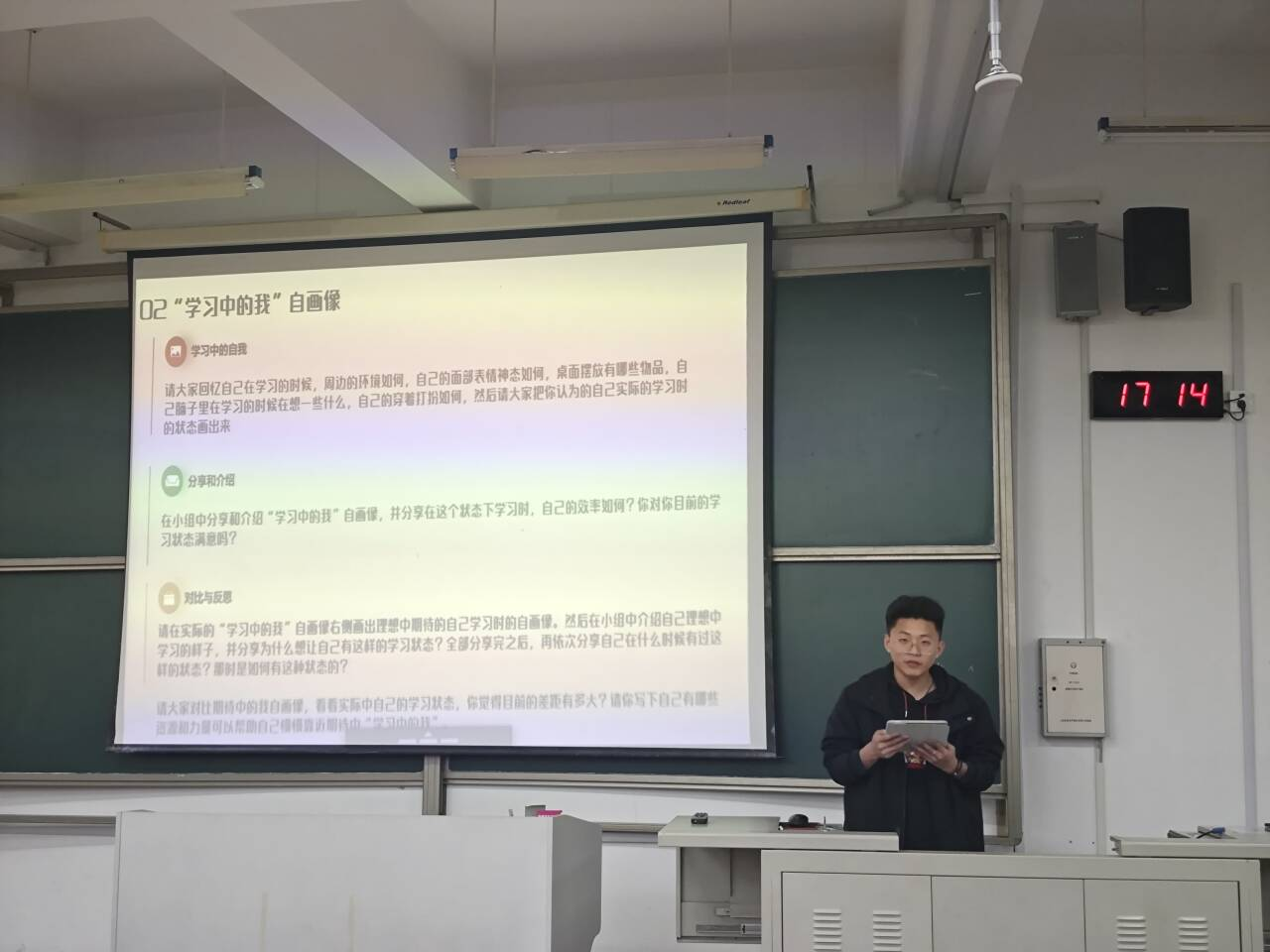随后,刘继儒让大家在纸张右侧空白处重新勾勒"理想中学习的模样"。几位同学主动展示了自己的画。刘继儒带领大家一起分析了图画中展示的学习中的问题,并给出了相应的学习建议。通过这个小活动,大家了解了许多科学高效的学习方法,也明确了自己要努力改变的方向。